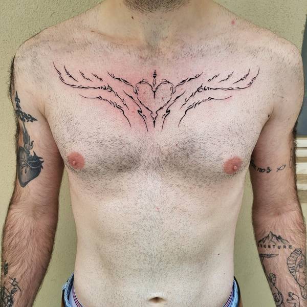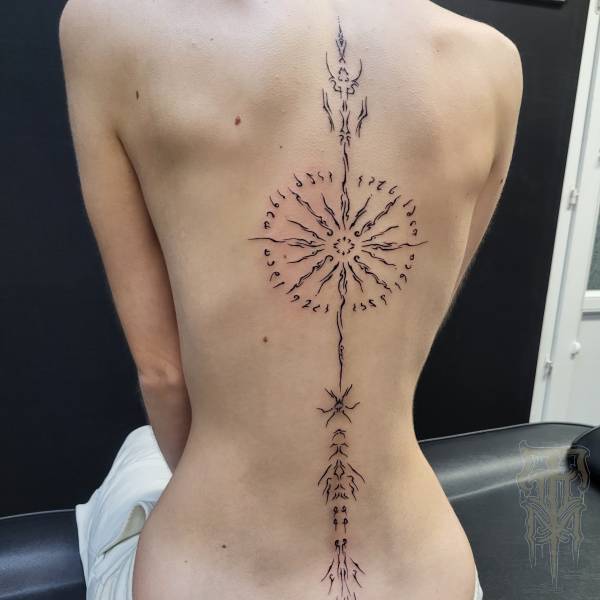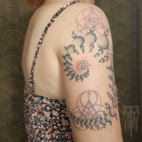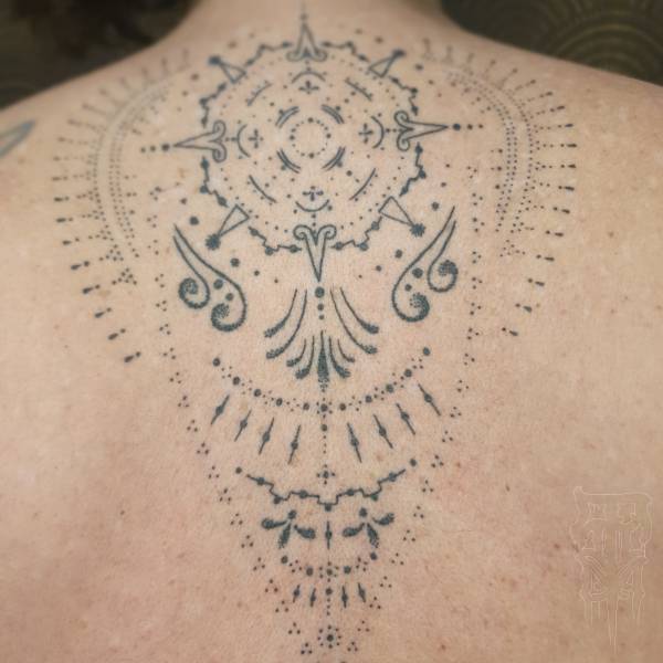 Fasciné par l’art médiéval, notamment les vitraux, il transpose dans ses tatouages la complexité des mandalas, jouant avec la lumière et les formes délicates semblables à de la dentelle. Son attrait pour la Mésoamérique, en particulier les civilisations aztèque et maya, influence également son travail. Leurs cultures, leurs rituels et leur art ancien l’inspirent à créer des pièces uniques, qu’il s’agisse de motifs sacrés ou d’expressions plus ethniques issues de la préhistoire de ces peuples.